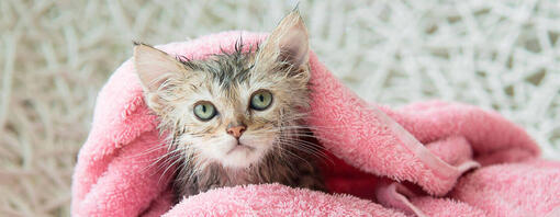 - Ten a mano un champú suave para gatitos, un recipiente para enjuagarlo y un par de toallas.